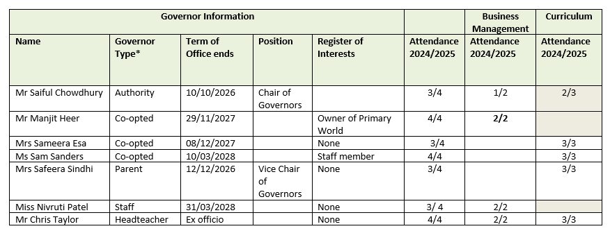 * Co-opted governors are appointed by the governing body, Authority governors are appointed by the Local Authority, parent governors are elected by the parent body and staff governors are elected by the staff body of the school.